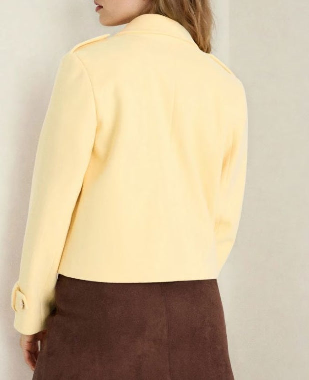 Its soft butter-yellow tone and gold buttons bring warmth and subtle elegance to any outfit, while the slightly oversized, “buggy” cut ensures comfort and effortless style.
